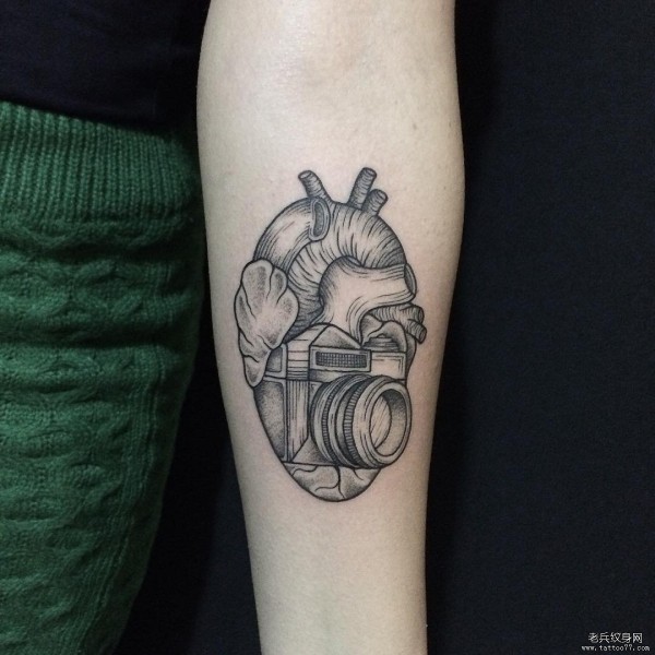 小臂黑灰心脏相机纹身tattoo图案