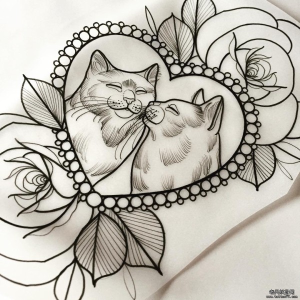 new school猫 玫瑰纹身图案手稿