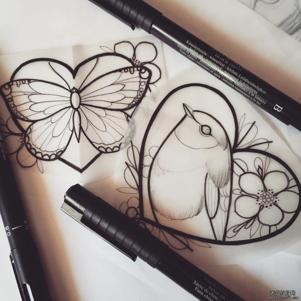 new school鸟蝴蝶爱心小清新纹身图案手稿