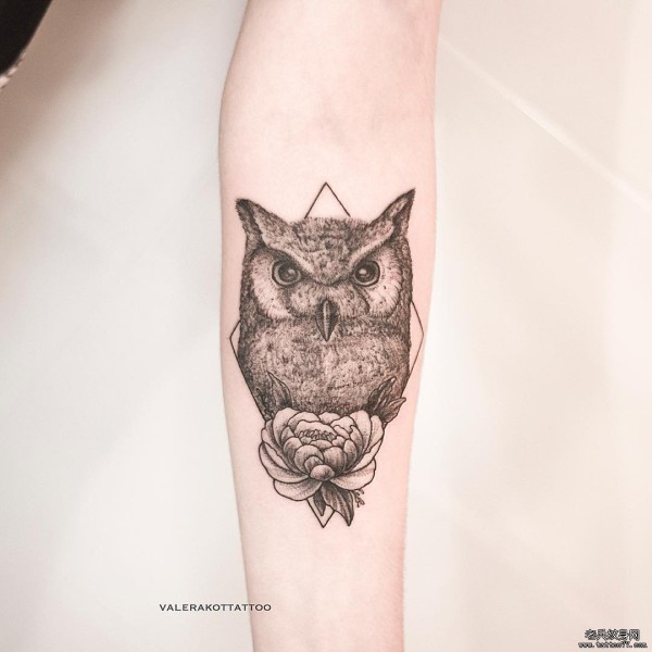 小臂几何线条猫头鹰花蕊纹身图案