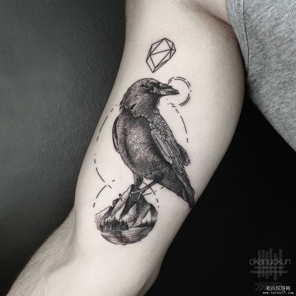 大臂乌鸦点刺风景线条几何黑灰纹身图案