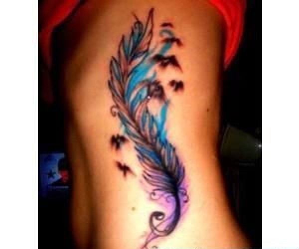 腰部彩色的大型羽毛纹身图案作品