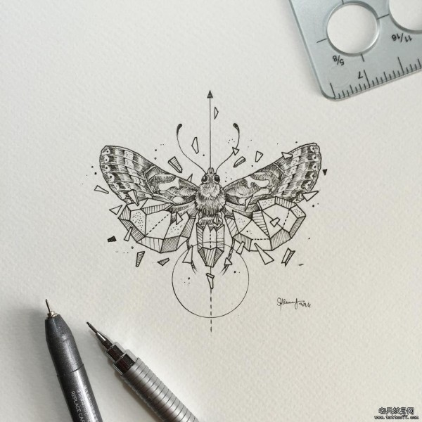 飞蛾点刺几何线条纹身图案手稿
