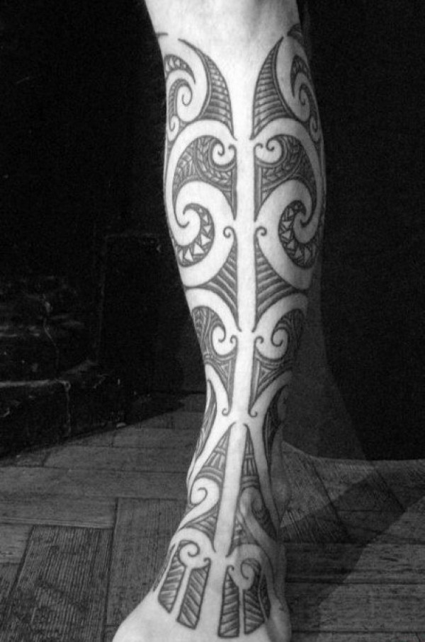 男性小腿上的帅气的黑色部落图腾纹身图案