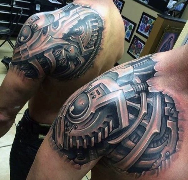 让人感觉无比有力的男性生物机械花臂纹身图案