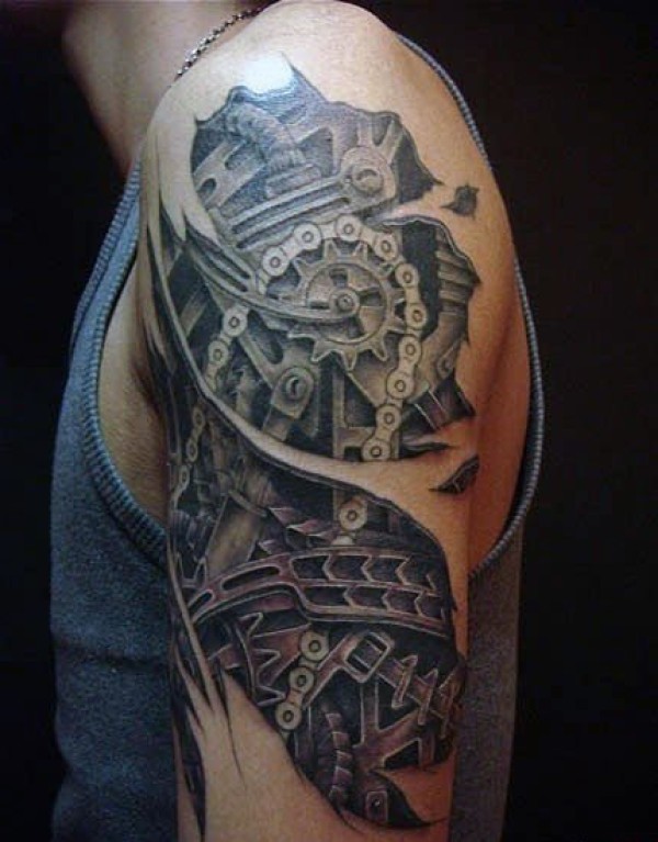 让人感觉无比有力的男性生物机械花臂纹身图案