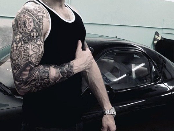 让人感觉无比有力的男性生物机械花臂纹身图案