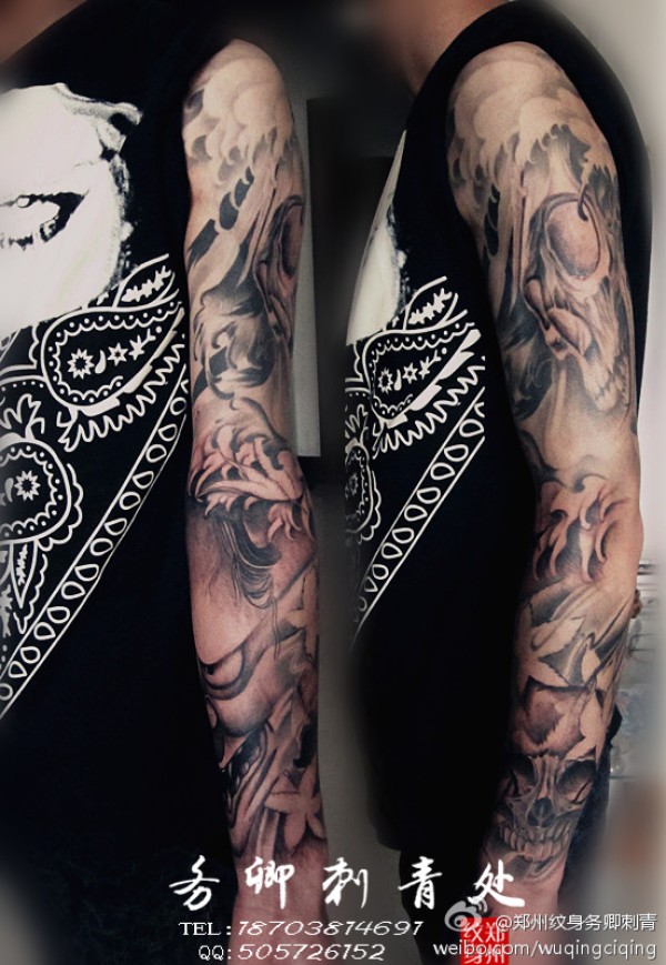 小臂纹了般若,又把大臂和小臂的骷髅修饰了一下