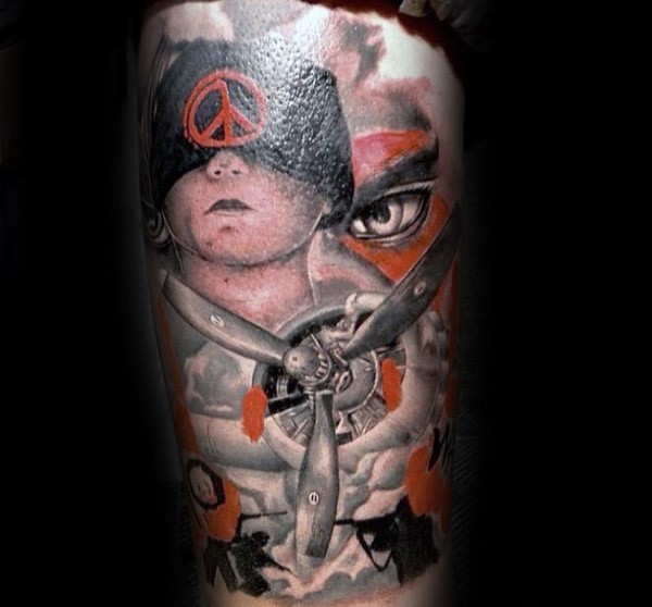 腿部彩色二战飞机纹身图片