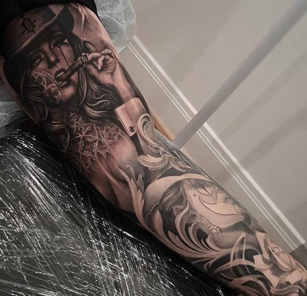 黑灰色现实主义花臂纹身半臂人物肖像纹身图案