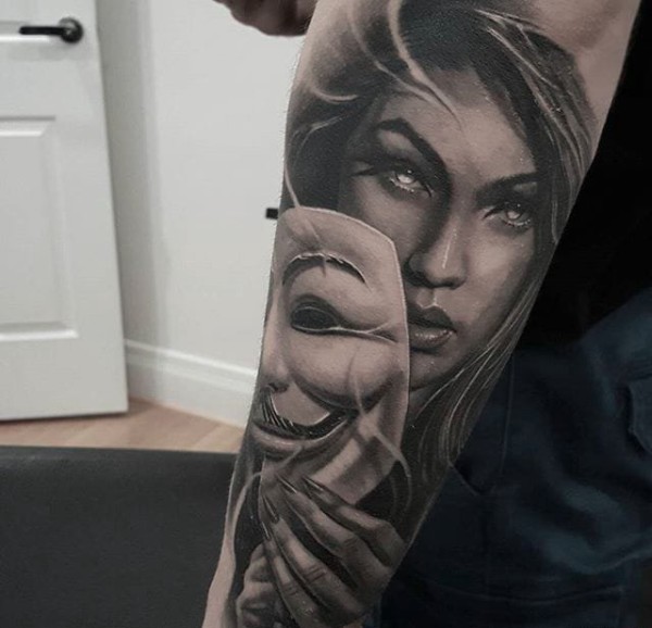 黑灰色现实主义花臂纹身半臂人物肖像纹身图案