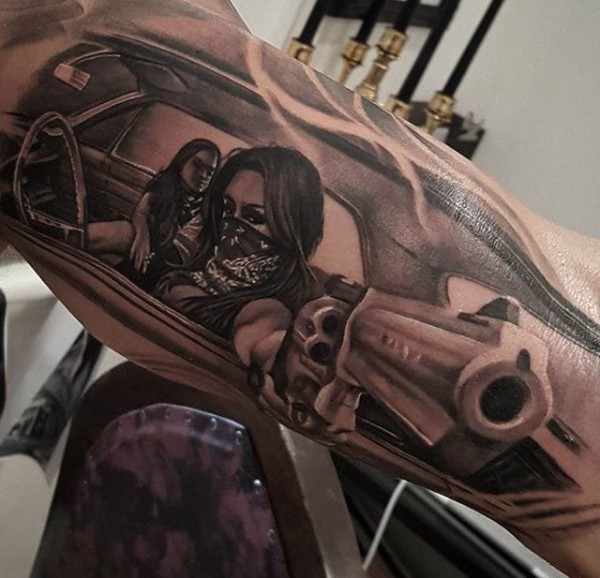 黑灰色现实主义花臂纹身半臂人物肖像纹身图案
