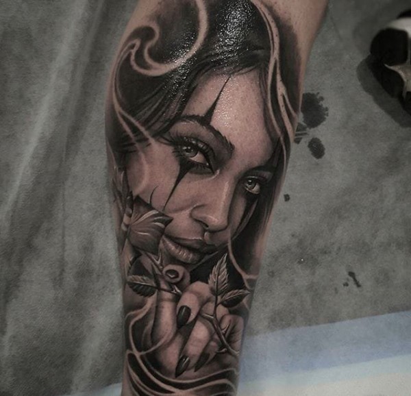 黑灰色现实主义花臂纹身半臂人物肖像纹身图案
