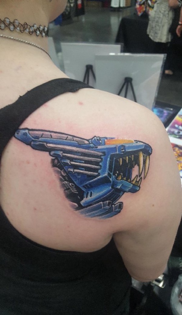 女性左肩背上叶片狮虎兽卡通漫画纹身图片