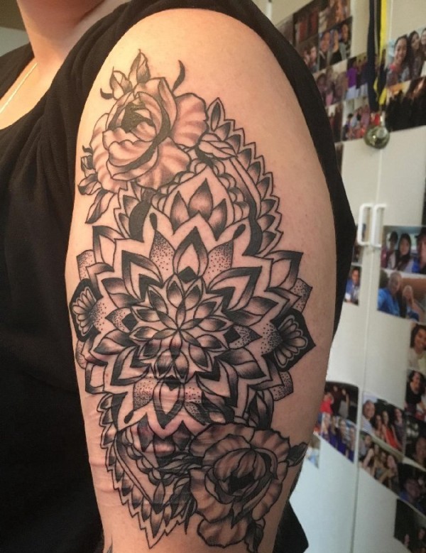 女生肩花纹身_15张女性双肩对称的肩花纹身图案作品图片