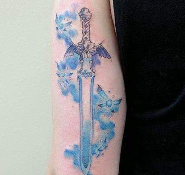 漂亮的蓝色蝴蝶缠绕着的手臂剑纹身图片