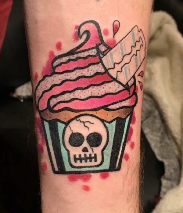 手臂上彩色的骷髅头纸杯蛋糕纹身图片