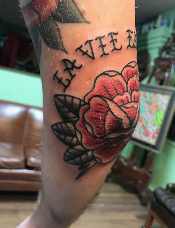手臂弯上黑色英文字母和红色玫瑰花纹身图片