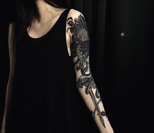 火辣女孩手臂蛇花蕊纹身图案个性十足