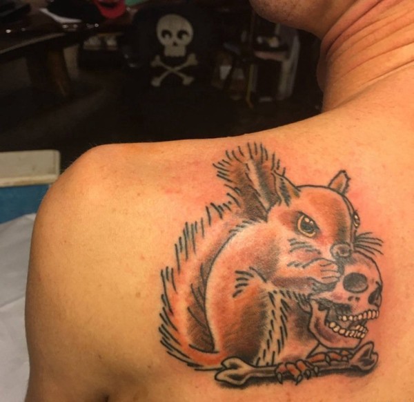 男性后肩背上可怕的松鼠吃骷髅头纹身图片