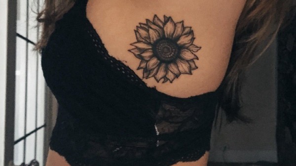 女性左侧肋下腋的黑灰色向日葵纹身图片