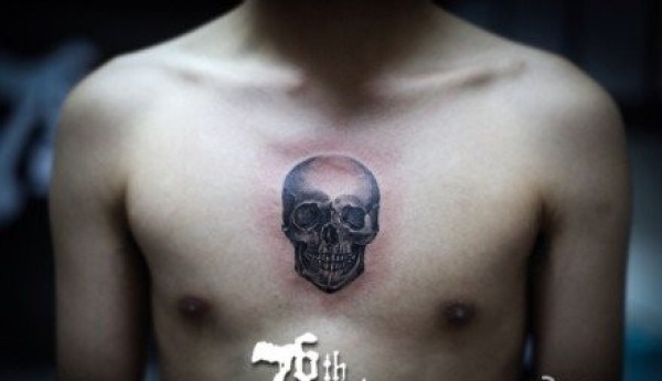男生前胸潮流很酷的黑灰骷髅纹身图案