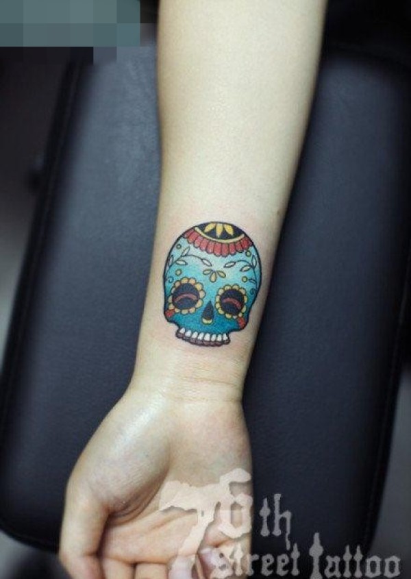 女生手腕小巧精美的彩色骷髅纹身图案