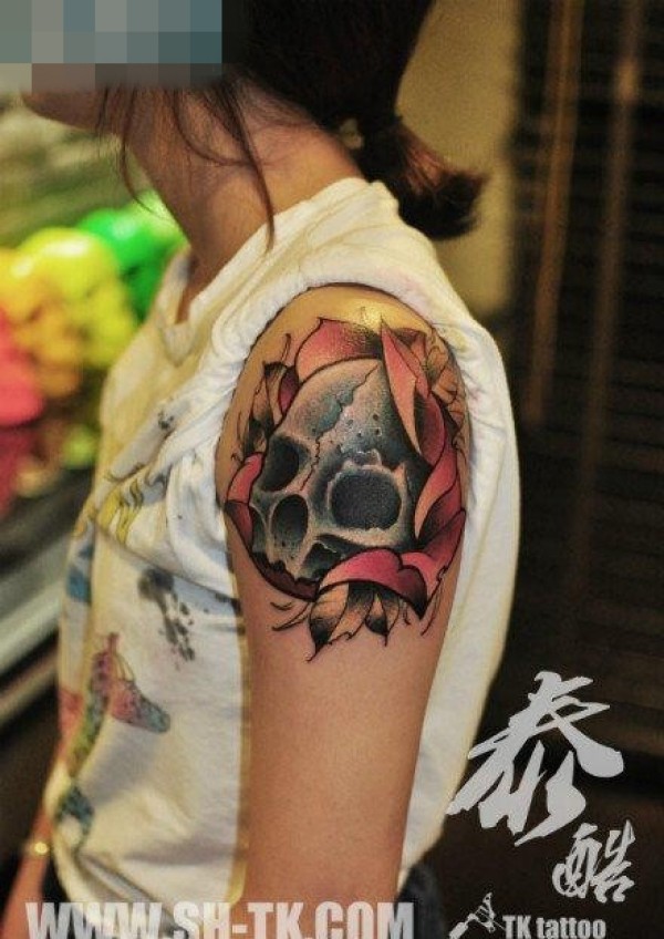 女生手臂经典潮流的骷髅与玫瑰花纹身图案