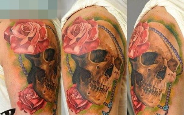 女生手臂经典潮流的骷髅与玫瑰花纹身图案