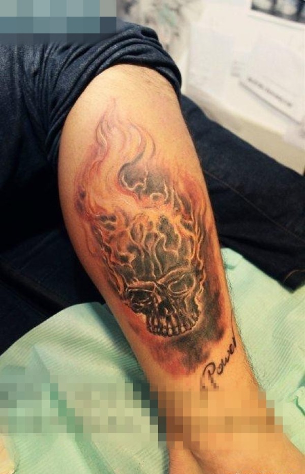 腿部时尚很酷的一张骷髅与火焰纹身图案