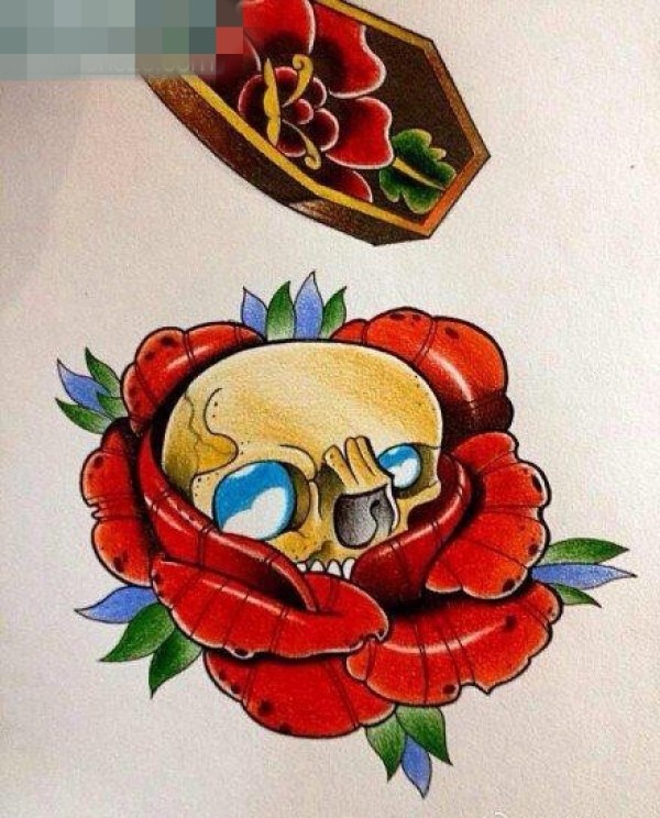 一张小巧潮流的骷髅玫瑰花纹身图案