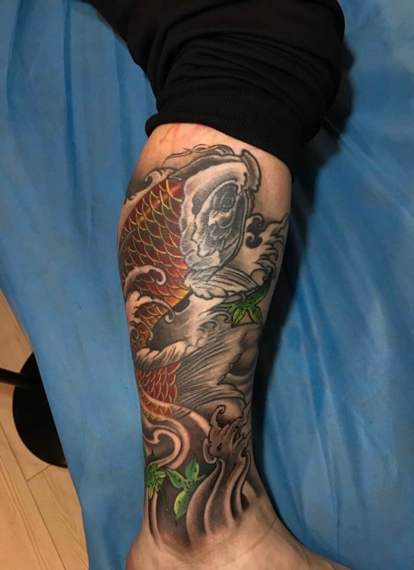 传统鲤鱼花小腿纹身_腿部纹身图案大全_纹身图吧