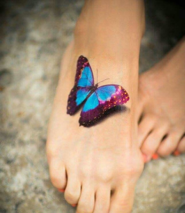 时尚女孩脚背上逼真的3d蝴蝶纹身刺青