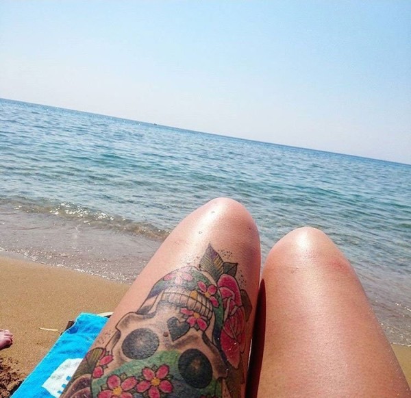 美丽女性身上漂亮的装饰风格骷髅头纹身图案