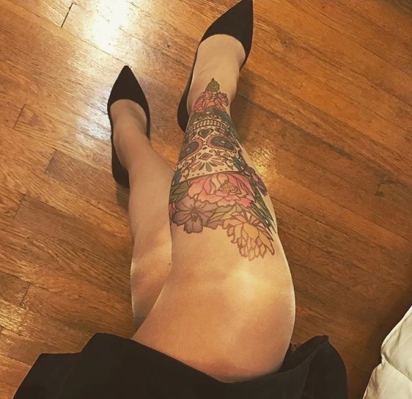 美丽女性身上漂亮的装饰风格骷髅头纹身图案