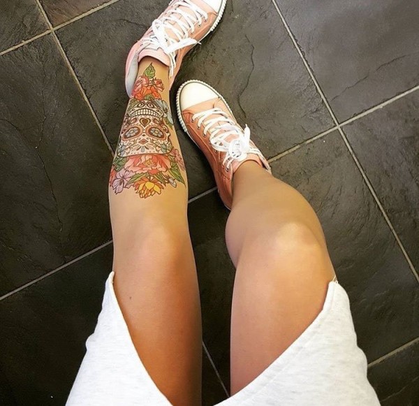 美丽女性身上漂亮的装饰风格骷髅头纹身图案
