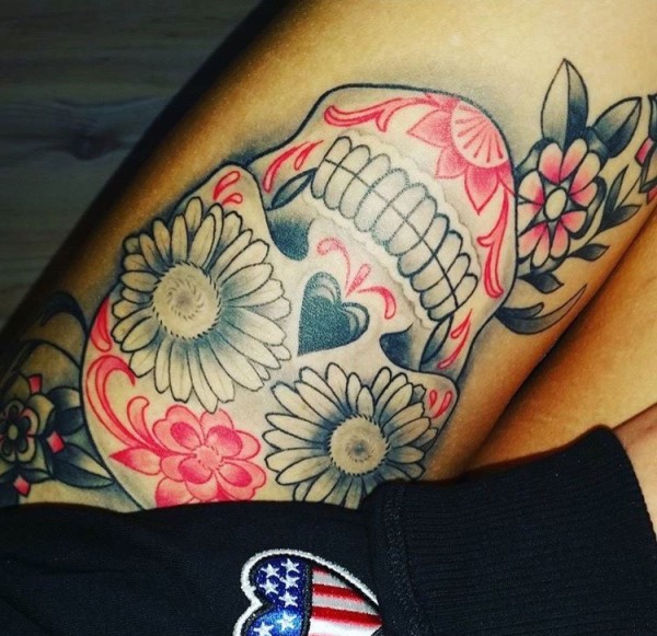 美丽女性身上漂亮的装饰风格骷髅头纹身图案