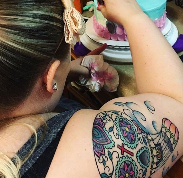 美丽女性身上漂亮的装饰风格骷髅头纹身图案