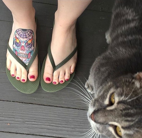 美丽女性身上漂亮的装饰风格骷髅头纹身图案