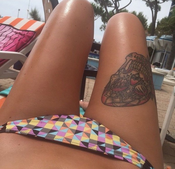 美丽女性身上漂亮的装饰风格骷髅头纹身图案