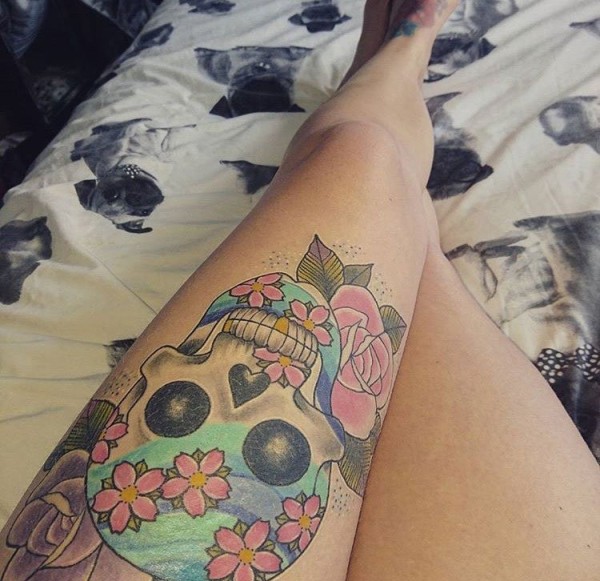 美丽女性身上漂亮的装饰风格骷髅头纹身图案