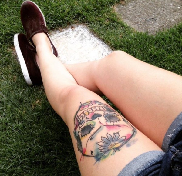 美丽女性身上漂亮的装饰风格骷髅头纹身图案
