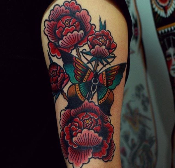 明亮大胆的传统风格植物花和动物图案纹身