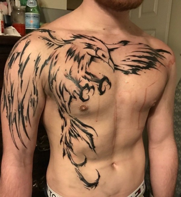 男性胸部至手臂上黑色的徒手凤凰纹身水墨画纹身图片