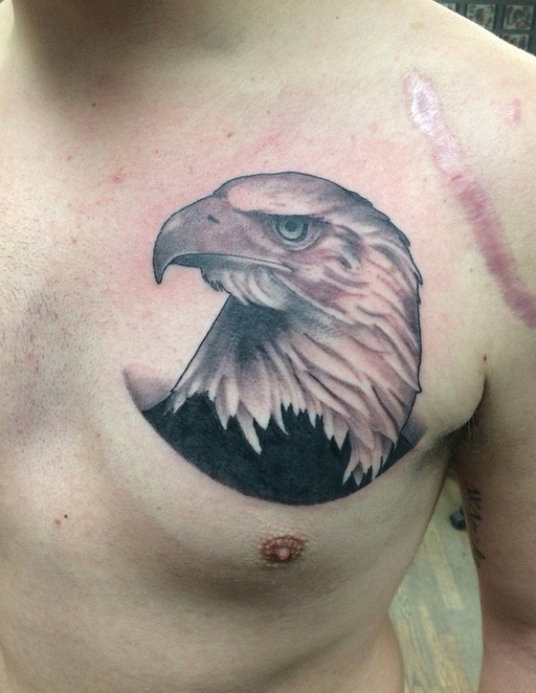 男性左胸部上黑灰色老鹰头纹身图片