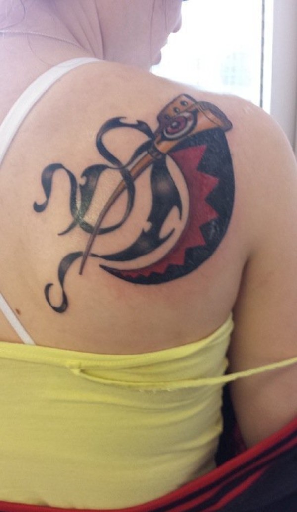 女性右后肩背上彩色的噬魂者的刀纹身图片
