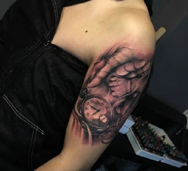手臂经典耐看的3d钟表手纹身刺青