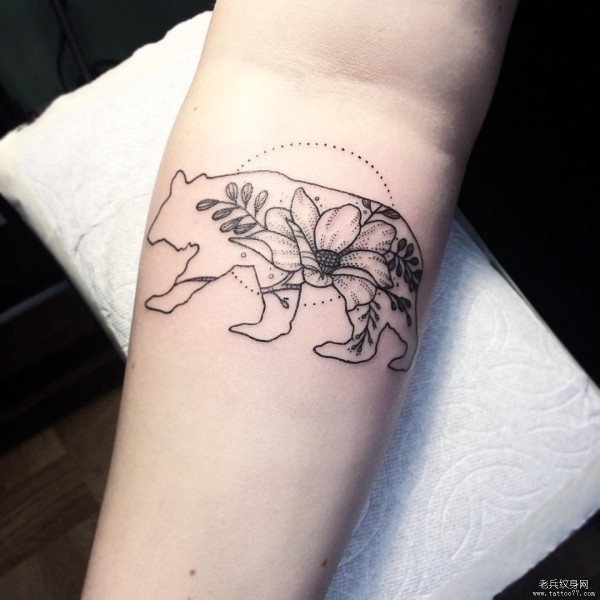 小臂熊纹花卉点刺纹身图案