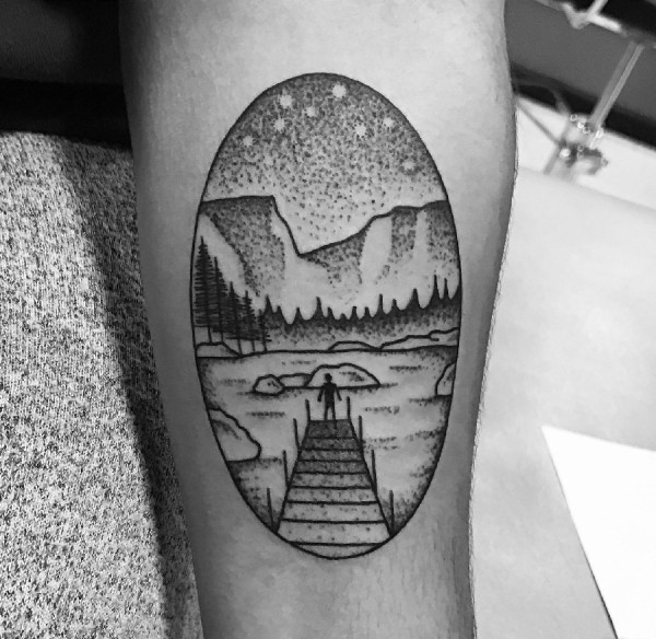 小腿上黑色夜空下的山水和人物背影纹身风景图片