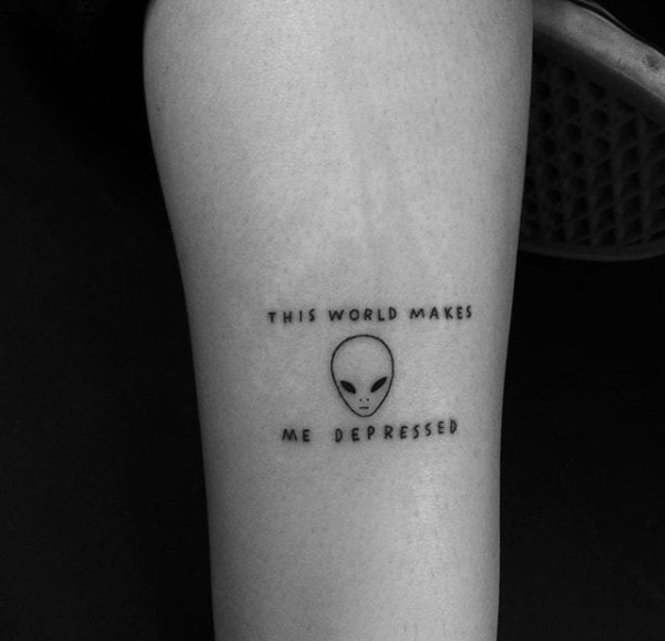 手臂上黑色的线条纹身猫和外星人纹身图案